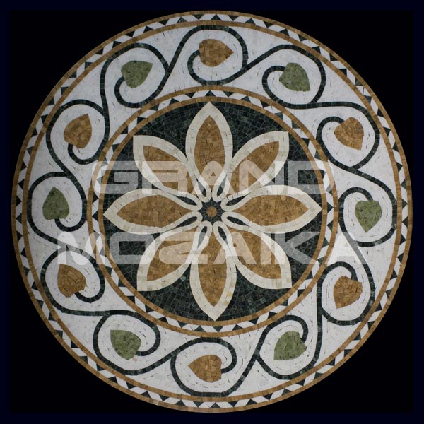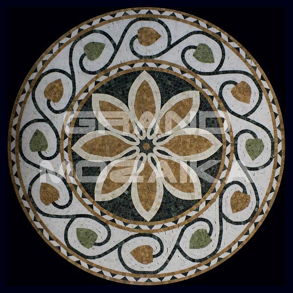 Мозаичные розоны NATURAL выложены из мрамора различных цветов.Панно круглой формы диаметром 1000 мм. Его можно использовать в интерьере как на стене, потолке или полу, как и любая мозаика она необычайно прочна. Такой ковер не оставит никого равнодушным и прослужит многие годы, не потеряв первоначальных свойств.
