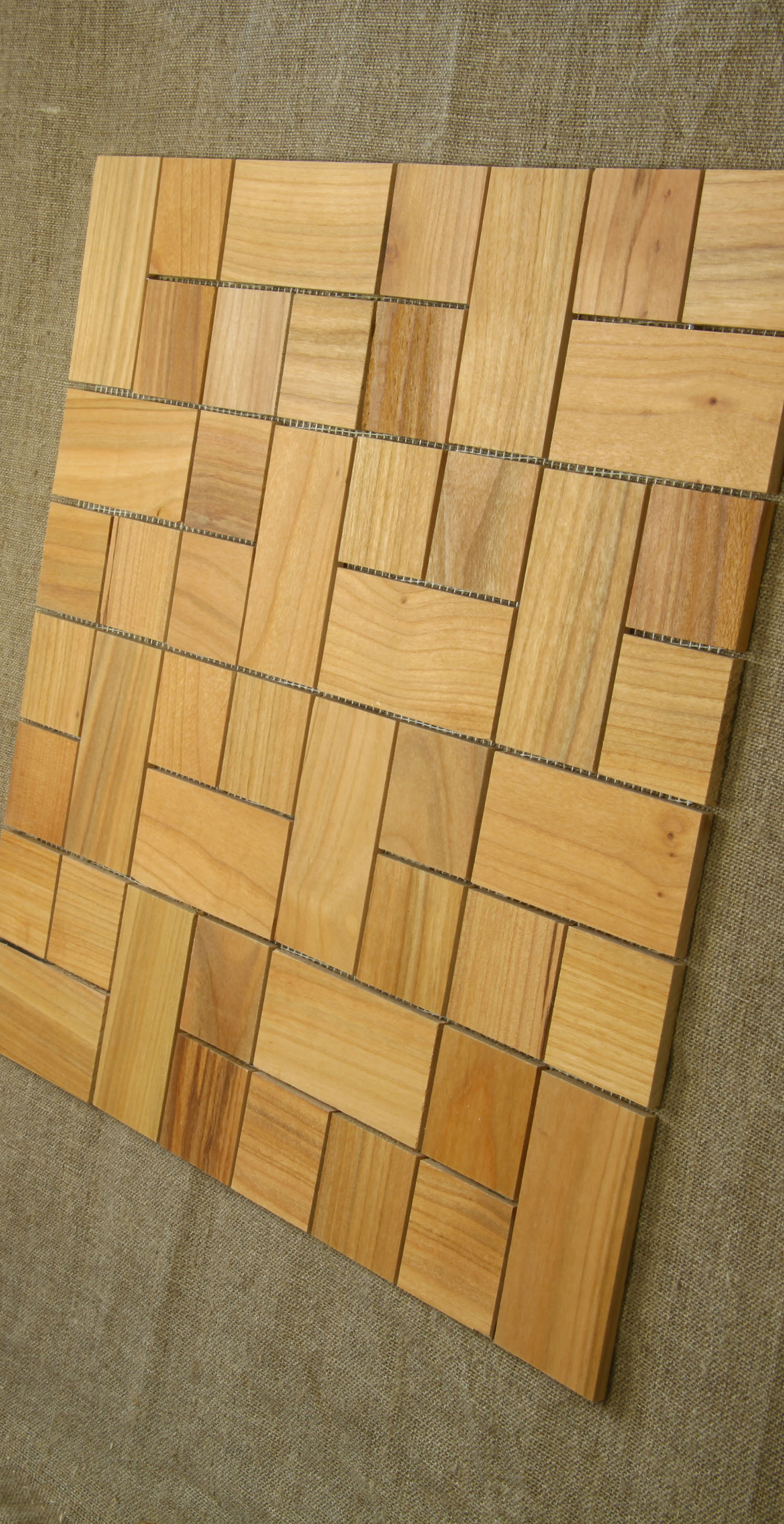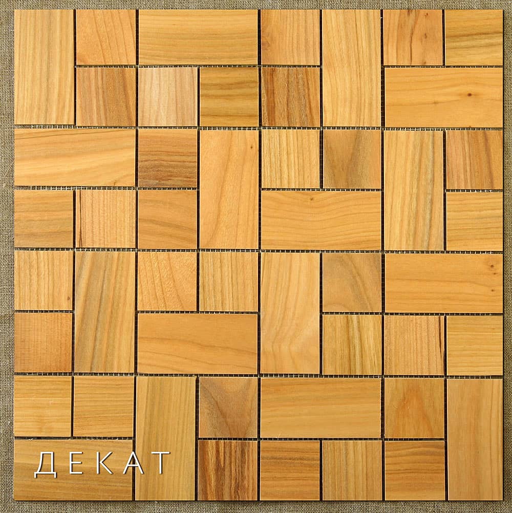 Деревянная мозаика, пропитанная натуральным маслом и покрытая пчелиным воском (не парафином), что делает ее устойчивой к влаге.