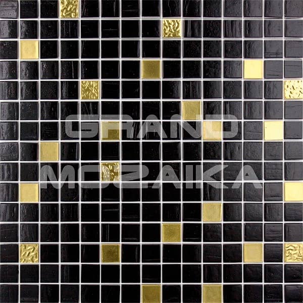 Мозаика для бассейнов серии Смеси состоит из маленьких кусочков размером 20х20 мм. Полотно выполнено из глянцевых мозаик черного цвета. Хаотическое вкрапление золотых мозаик придает ему роскоши. Полотно размером 327х327 удобно в монтаже и не требует особых навыков.Такая мозаика будет необычно смотреться в интерьере бассейна в стиле модерн.