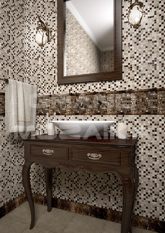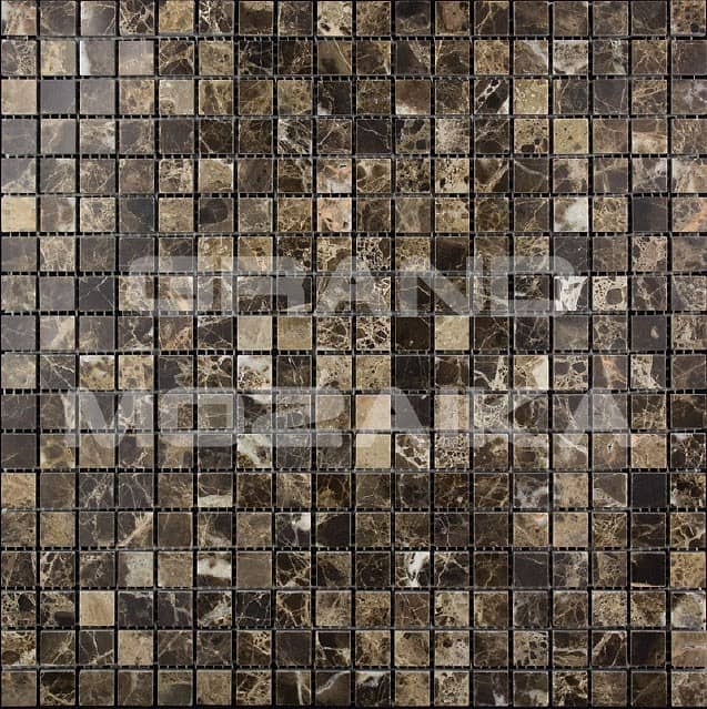 Мозаика из натурального камня серии Adriatica состоит из маленьких кусочков размером 15х15 мм. Полотно 305х305 выполнено из полированного коричневого мрамора . Такая мозаика прослужит долгие годы и не потеряет своих свойств.