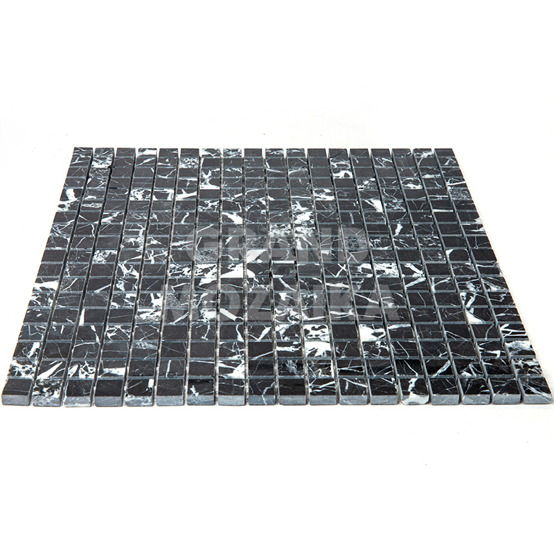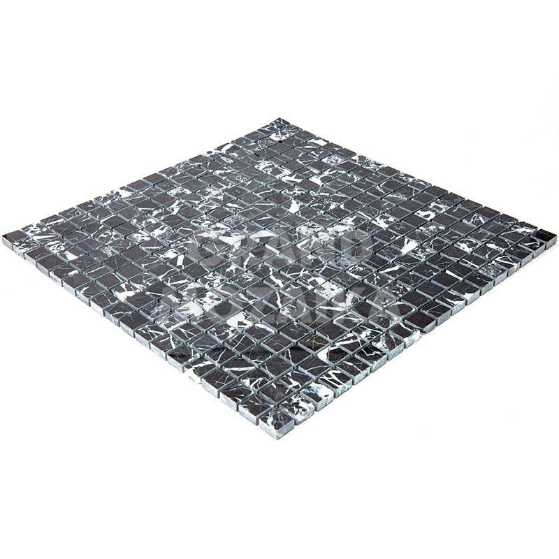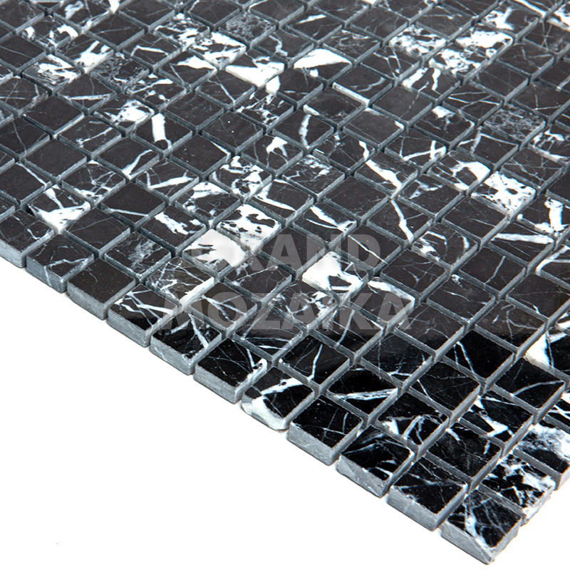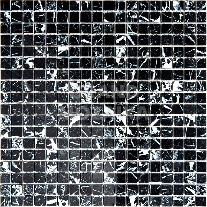 Мозаика из натурального камня серии Adriatica состоит из маленьких кусочков размером 15х15 мм. Полотно 305х305 выполнено из полированного черного мрамора с характерным рисунком. Такую мозаику можно использовать в различных помещениях, она прослужит гарантированно долго и не поменяет своих свойств.