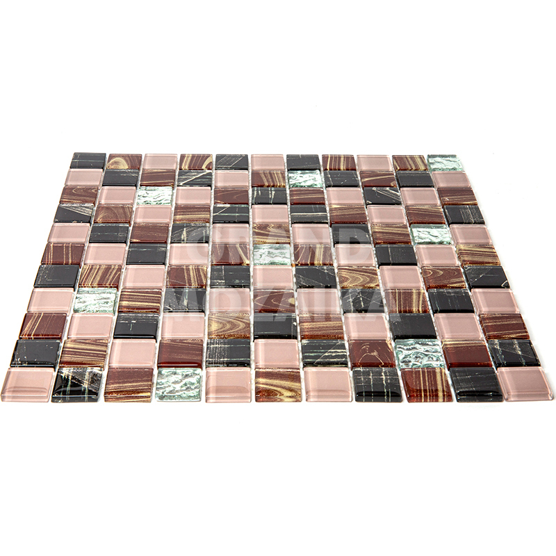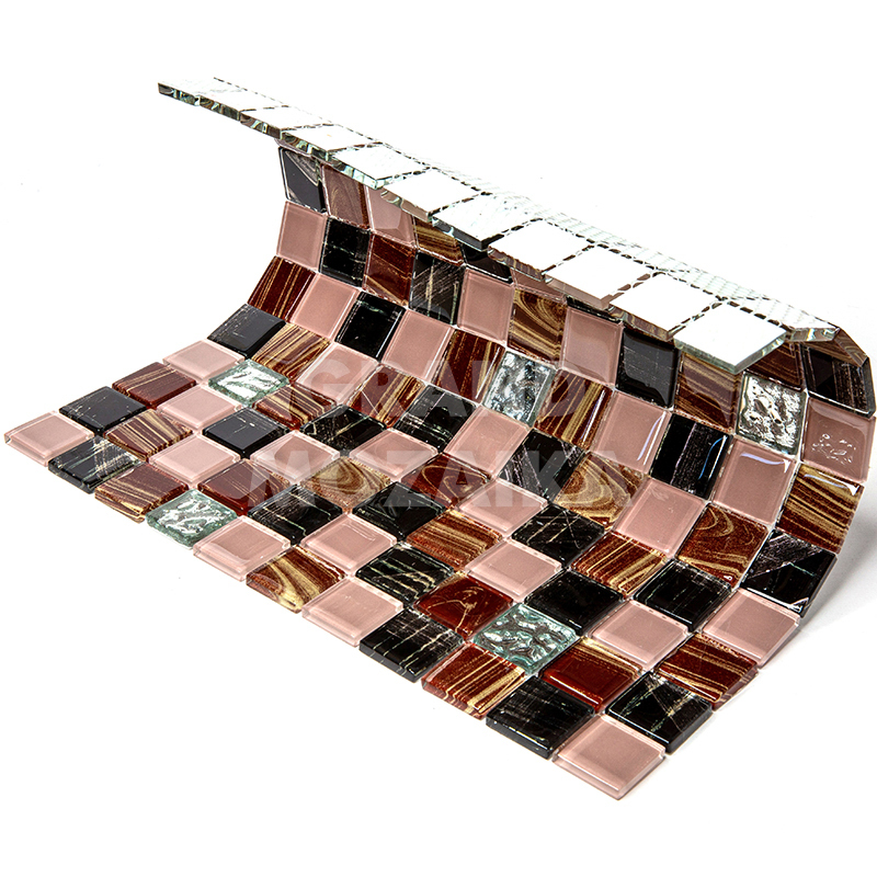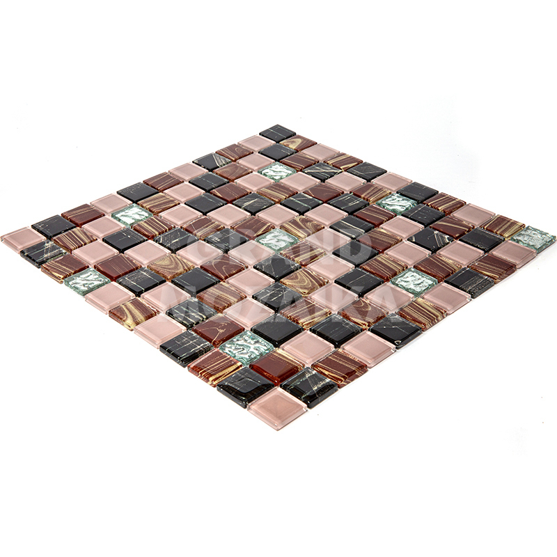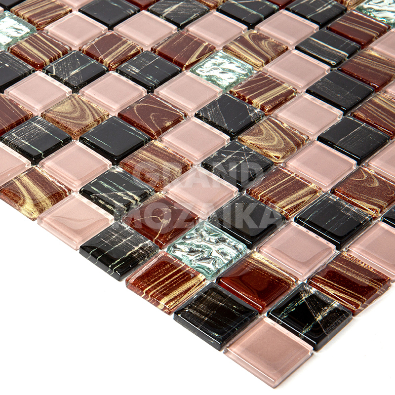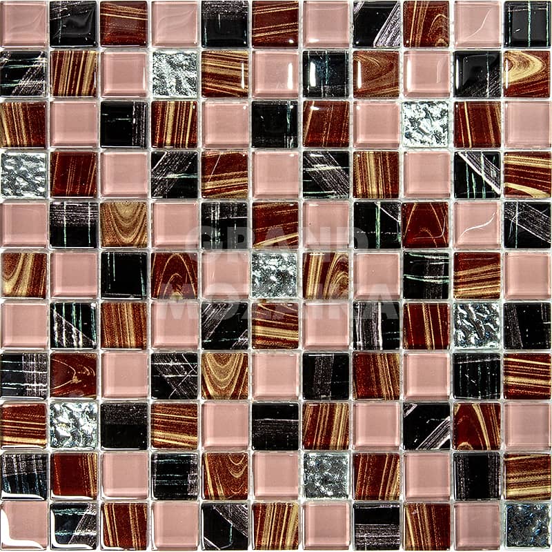 Стеклянная мозаика серии Flash. Состоит из мелких (25х25 мм) кусочков коричневого, черного, серебряного и бежевого цвета. Добавление элементов с оригинальным рисунком придают полотну объем. Идеально подходит для отделки ванных комнат и других помещений. Поверхность глянцевая, размер сетки 295х295 мм. Толщина мозаики - 5 мм.