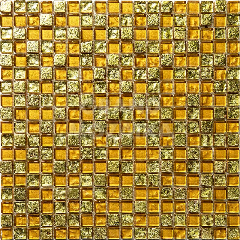 Элитная мозаика Luxury серии Inka состоит из кусочков размером 15х15 мм. Полотно выполнено из мозаик желтого и золотого цветов. Вкрапление мозаик с незамысловатым орнаментом делает полотно оригинальным. Интерьер дополненный такой мозаикой окунет вас в анналы древности.