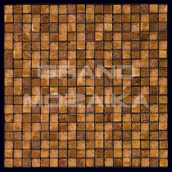 Элитная мозаика Luxury серии Inka состоит из кусочков размером 15х15 мм. Полотно выполнено из мозаик приглушенного коричневого и оранжевого цвета. Вкрапление мозаик с незамысловатым орнаментом делает полотно оригинальным. Интерьер дополненный такой мозаикой окунет вас в анналы древности.