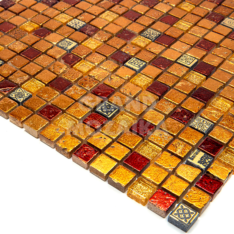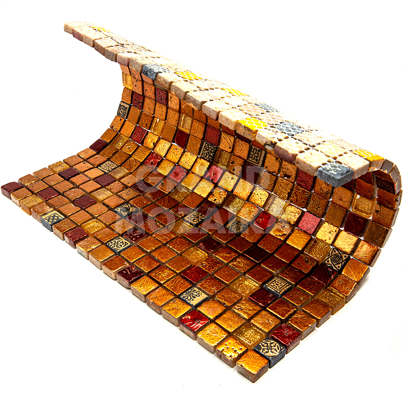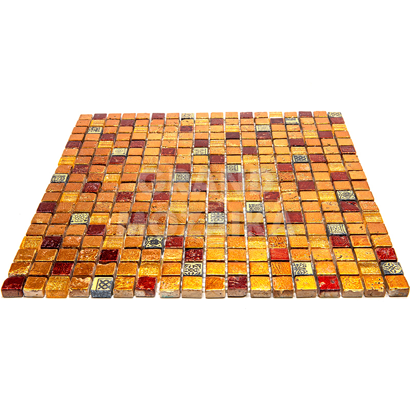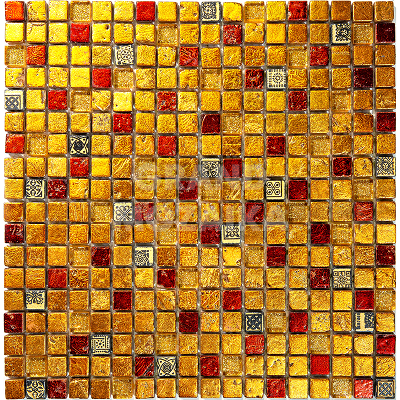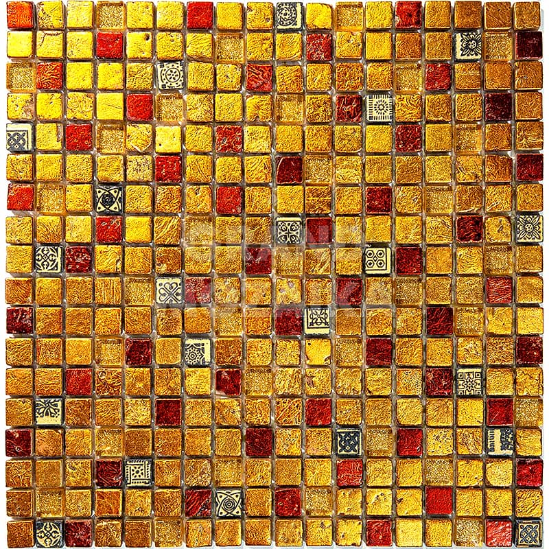 Элитная мозаика Luxury серии Inka состоит из кусочков размером 15х15 мм. Полотно выполнено из мозаик темно-оранжевого и золотого цветов. Вкрапление мозаик с незамысловатым орнаментом делает полотно оригинальным. Интерьер дополненный такой мозаикой окунет вас в анналы древности.