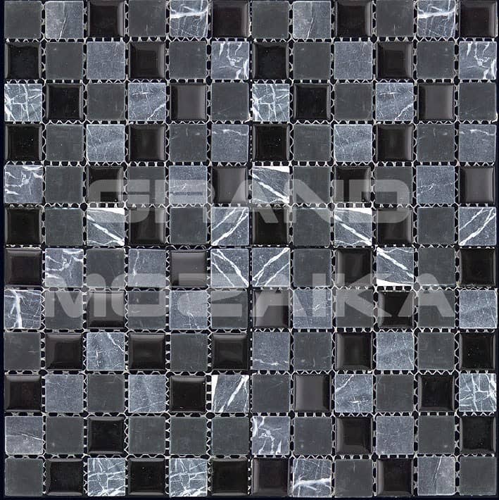 Микс мозаика серии Mix Glass&Stone состоит из кусочков размером 23х23 мм. Полотно размером 300х300 мм состоит из стеклянных и каменных мозаик различных оттенков серого и черного цвета. Такая мозаика послужит оригинальным дополнение любого интерьера.