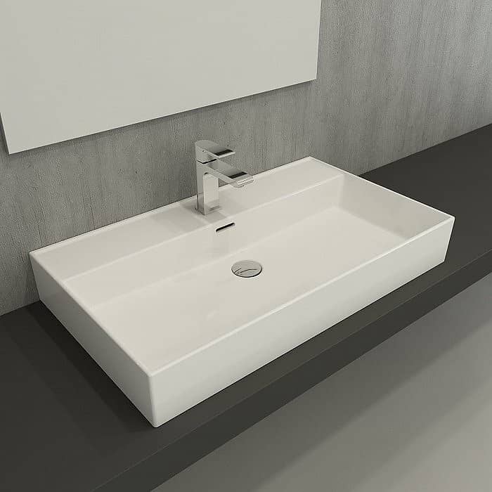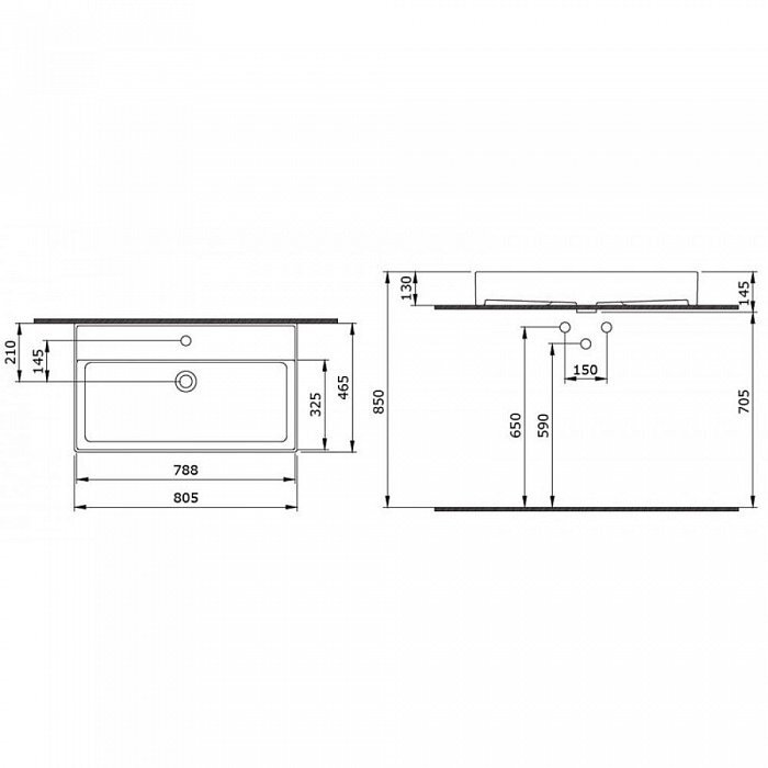 С одним отверстием для смесителя, отверстие перелива. Установка на столешницу или на стене. Без донного клапана в комплекте