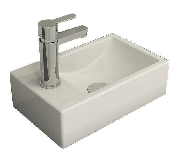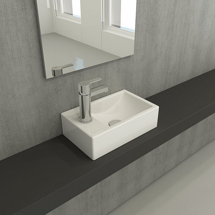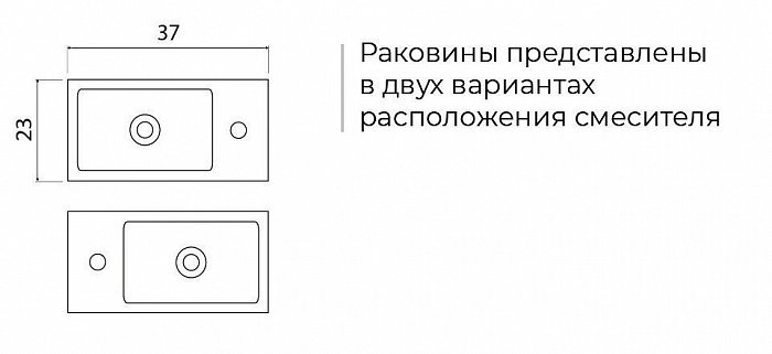 С одним отверстием для смесителя, без перелива. Установка на столешницу или на стене. Без донного клапана в комплекте