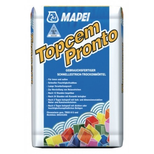 Topcem Pronto - готовая к применению смесь специальных гидравлических вяжущих, фракционированных заполнителей и специальных добавок. После смешивания с водой позволяет получить бетон с нормальным временем схватывания, быстрым набором прочности и отсутствием усадки вне зависимости от толщины укладки. Стяжки, выполненные с помощью Topcem Pronto, уже через 4 дня имеют остаточную влажность менее 2%, что позволяет укладывать покрытия, чувствительные к влажности - ковровые покрытия, линолеум, покрытия из ПВХ, паркет.