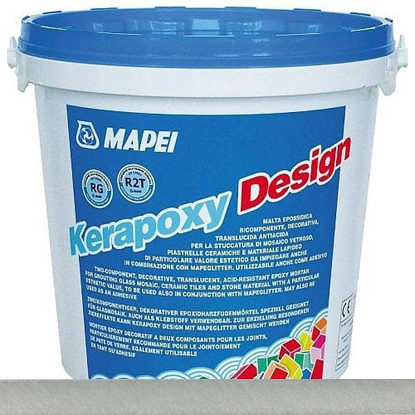 Технические характеристики Kerapoxy Design: Двухкомпонентный, декоративный шовный заполнитель на основе эпоксидной смолы с добавлением кварцевого песка и других специальных компонентов, обладающий свойствами высокой стойкости и легкостью при очистке. Kerapoxy Design можно смешивать с MapeGlitter (до 10% по весу), металлизированной цветной добавкой, придающей особый эффект перламутрового блеска. При правильном нанесении образуются швы со следующими характеристиками: