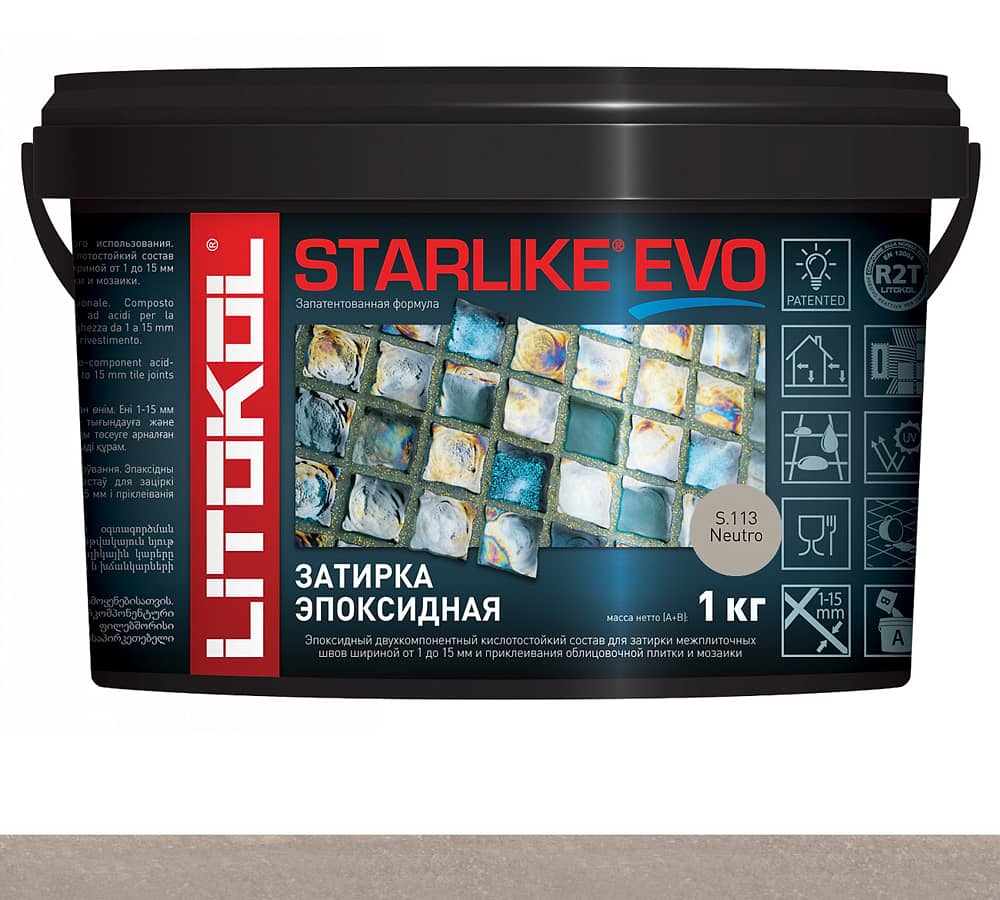 STARLIKE EVO двухкомпонентныи эпоксидныи кислотостоикии, щелочестоикии состав для затирки межплиточных швов с ширинои шва от 1 до 15 мм и использования в качестве клея для всех видов облицовочнои плитки и мозаики.